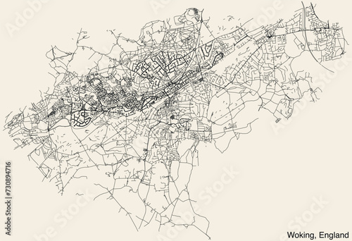 Naklejka premium Detailed hand-drawn navigational urban street roads map of the United Kingdom city township of WOKING, ENGLAND with vivid road lines and name tag on solid background