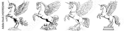 Fototapeta premium Detailed hand-drawn vector illustration of magical winged unicorns in various...