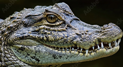 © Shahid, Obraz premium Detailed Head Portrait Highlighting Black Caiman Reptile Scales and Texture