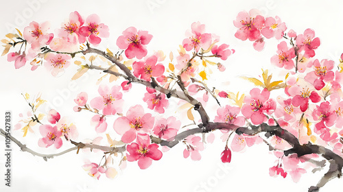© Thiago, Naklejka premium Detailed high-resolution watercolor painting of chinese style pink plum blossom branch on white background. Blossoming Sakura Trees. Illustration