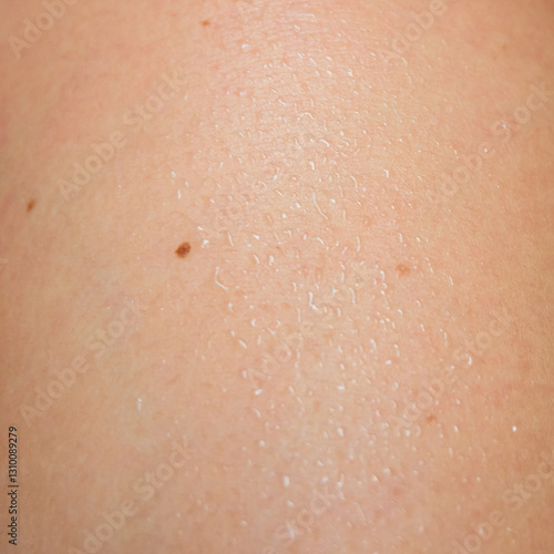 Fototapeta premium Detailed human skin with small moles and water drops, showcasing natural...