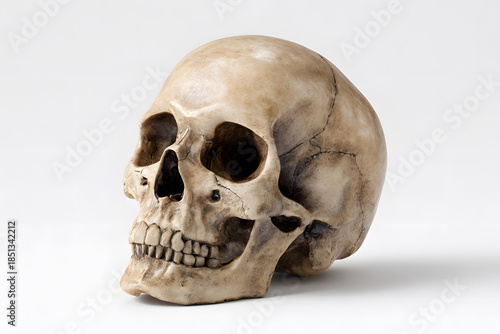 © krasyuk, Naklejka premium Detailed human skull displayed on a plain surface showing its anatomical features and structure in a well-lit environment