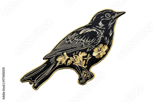© MD USUB BISWAS, Obraz premium Detailed illustration of a bird with floral patterns isolated on transparent background. Black and gold patch with a bird isolated on white background.