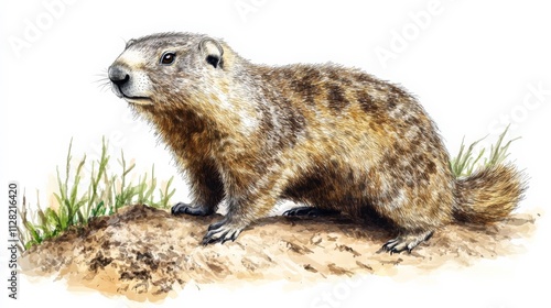 Naklejka premium Detailed Illustration of a Groundhog Seated on a Soil Mound Surrounded by Grass, Capturing the Essence of This Fascinating Rodent Species