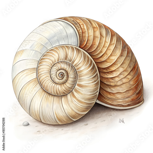 © Mol, Obraz premium Detailed illustration of a nautilus shell with a spiral pattern on sand.
