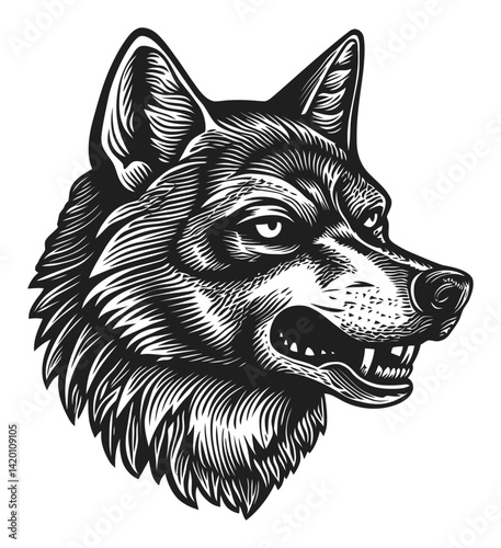 © devi, Obraz premium Detailed Illustration of a Wolf Head in Woodcut Style Artwork