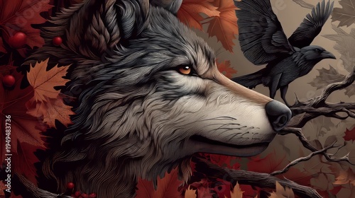 © Malika, Naklejka premium Detailed Illustration of a Wolf in an Autumn Forest Setting
