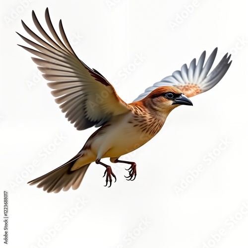© Pete, Obraz premium Detailed illustration of house sparrow in flight. Photorealistic rendering shows intricate wing details, feather patterns. Bird in mid-air against plain white background. Natural colors, lighting