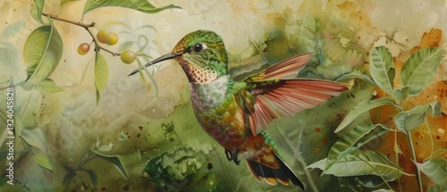 Fototapeta premium Detailed illustration of hummingbird in flight among greenery, suitable for...