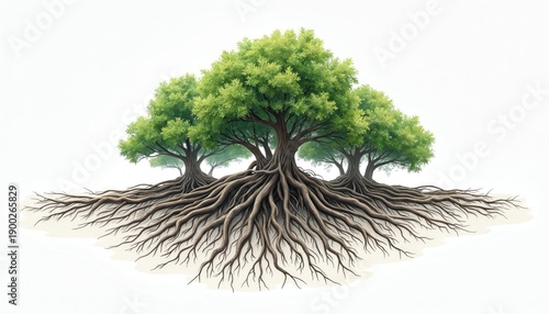 © Pete, Fototapeta premium Detailed illustration of interconnected tree roots spreading wide. Green canopy tops multiple ancient trees creating dense forest look. Clean white background isolates natural elements for