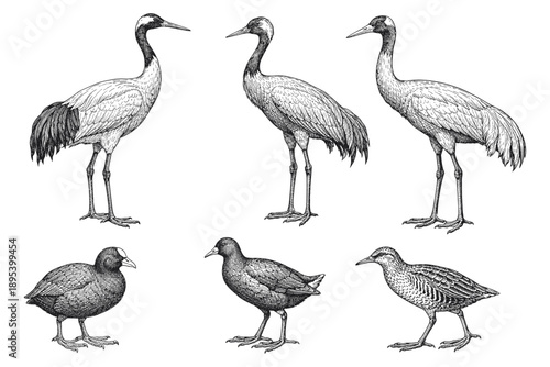 Fototapeta premium Detailed illustrations of diverse bird species: cranes, coots, snipe