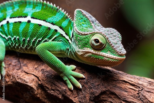 Fototapeta premium Detailed Image of a Bright Green Chameleon in Its Natural Forest Habitat