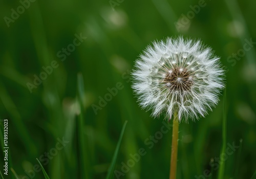 Fototapeta premium Detailed image of a fluffy white dandelion seed head, also known as a blowball, standing tall in a vibrant green meadow symbolizing wishes ,taraxacum ,fragile ,may