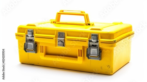 Fototapeta premium Detailed image of a rugged toolbox, bright yellow features, ideal for all repair tasks, isolated white background, studio lights, durable build