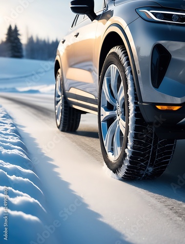 Naklejka premium Detailed image of a vehicle driving through snowy terrain, emphasizing winter tires, road safety, and enhanced performance in freezing cold environments