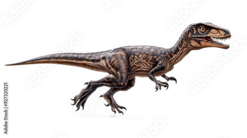© arhendrix, Naklejka premium Detailed image of a velociraptor dinosaur toy against a white background showcasing intricate details and a realistic design.