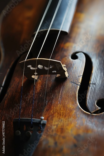 © StockUp, Fototapeta premium Detailed image of a violin's bridge and strings, emphasizing the craftsmanship and elegance of the musical instrument.