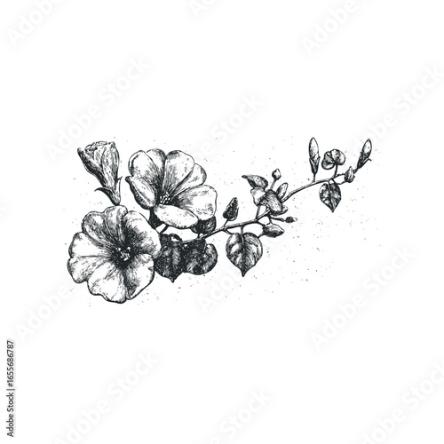 Naklejka premium Detailed Ink Drawing of Convolvulus Flowers and Buds on a Branch