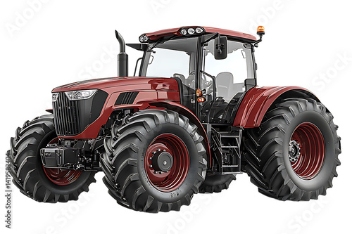 © Kapil, Obraz premium Detailed Isolated Maroon Tractor with Large Tires on Black Backdrop, Machinery