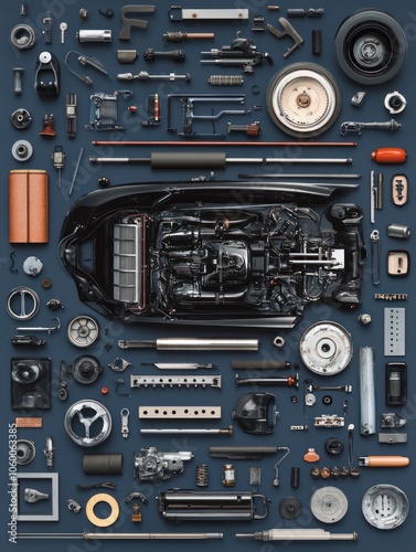 © jodoto, Fototapeta premium Detailed Knolling Layout of Black Car Parts and Engine Components on a Dark Background
