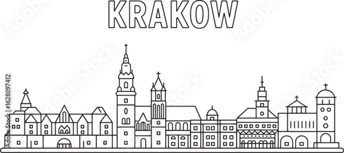 Fototapeta premium Detailed Krakow Cityscape Outline Silhouette Vector Illustration with Architectural Landmarks and Text