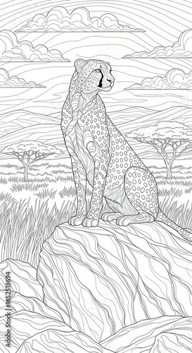 Naklejka premium Detailed line art illustration of a regal cheetah in a savanna landscape