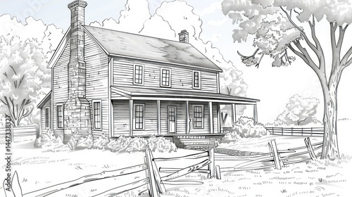 © Chandara, Fototapeta premium Detailed line art of a rustic farmhouse
