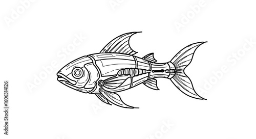 © Rafael, Fototapeta premium Detailed line art of mechanical fish illustration for coloring pages and tattoo design vector drawing artwork