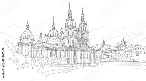 Fototapeta premium Detailed line drawing of a historic European cathedral complex.