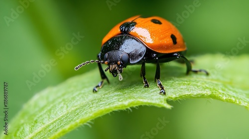 Fototapeta premium Detailed Macro Image of Orange Black Ladybug on Leaf in Garden Setting :...