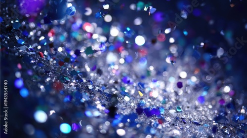 Obraz premium Detailed macro photograph of silver and blue confetti sparkling and exploding...