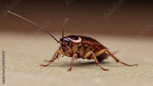 © Rimsha, Naklejka premium Detailed macro photography of a brown cockroach on a textured surface, showcasing its segmented body and long antennae with sharp focus and natural lighting.