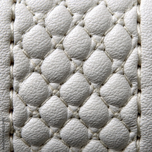 © STK, Naklejka premium Detailed macro shot of a white leather material featuring a diamond shaped quilting pattern and visible stitching. The texture shows a subtle grain and a slightly reflective surface.