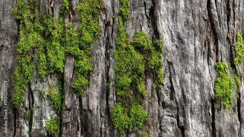 © Liew, Obraz premium Detailed macro view of rough grey tree bark with vibrant green moss growth