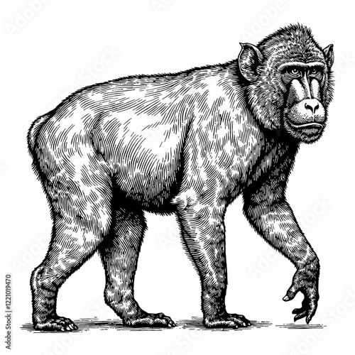 © Reytr, Obraz premium Detailed Mandrill Monkey Walking Side View Black and White Outline Line Art Drawing
