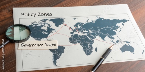 © Asraf, Fototapeta premium Detailed Map of Policy Zones Highlighting Governance Scope with Magnifying Glass and Pen on Wooden Table