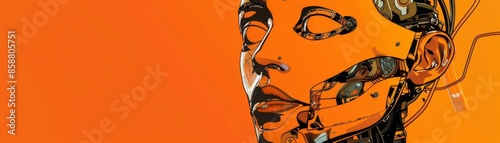 © chakrapong, Fototapeta premium Detailed mechanical face on orange background, promoting AI newsletter.