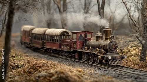 © Andi, Fototapeta premium Detailed model train moving through a wintry forest scene.