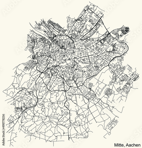 © Momcilo, Fototapeta premium Detailed navigation black lines urban street roads map of the AACHEN-MITTE DISTRICT of the German regional capital city of Aachen, Germany on vintage beige background