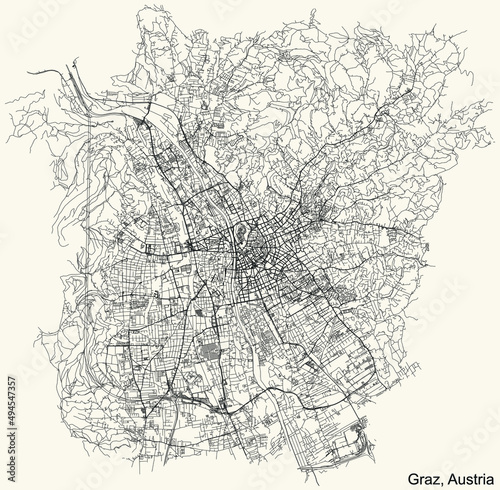 © Momcilo, Fototapeta premium Detailed navigation black lines urban street roads map of the Austrian regional capital city of GRAZ, AUSTRIA on vintage beige background