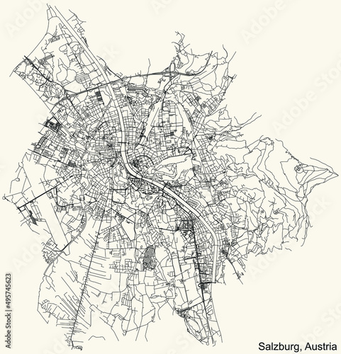 Fototapeta premium Detailed navigation black lines urban street roads map of the Austrian regional capital city of SALZBURG, AUSTRIA on vintage beige background
