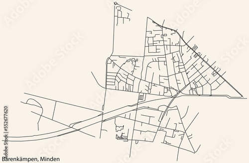 © Momcilo, Fototapeta premium Detailed navigation black lines urban street roads map of the BÄRENKÄMPEN QUARTER of the German town of MINDEN, Germany on vintage beige background