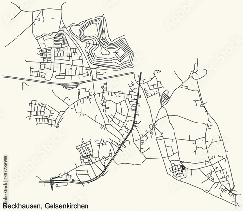 © Momcilo, Fototapeta premium Detailed navigation black lines urban street roads map of the BECKHAUSEN DISTRICT of the German regional capital city of Gelsenkirchen, Germany on vintage beige background