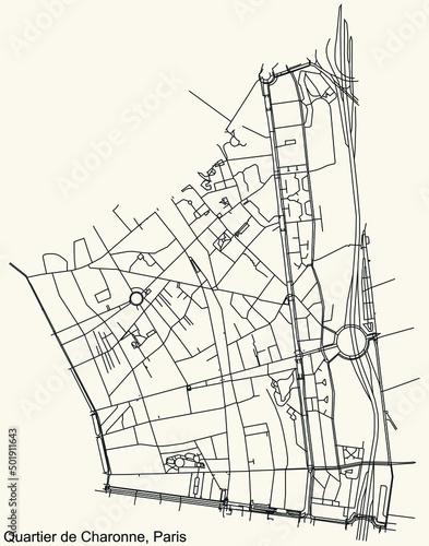 Naklejka premium Detailed navigation black lines urban street roads map of the CHARONNE QUARTER of the French capital city of Paris, France on vintage beige background