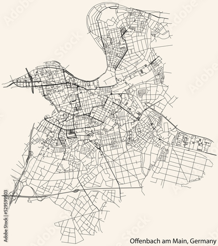 © Momcilo, Naklejka premium Detailed navigation black lines urban street roads map of the German regional capital city of OFFENBACH AM MAIN, GERMANY on vintage beige background