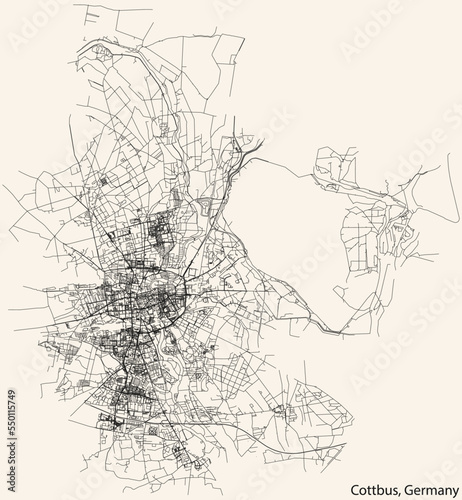 © Momcilo, Fototapeta premium Detailed navigation black lines urban street roads map of the German town of COTTBUS, GERMANY on vintage beige background