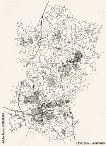 Fototapeta premium Detailed navigation black lines urban street roads map of the German town of DORSTEN, GERMANY on vintage beige background