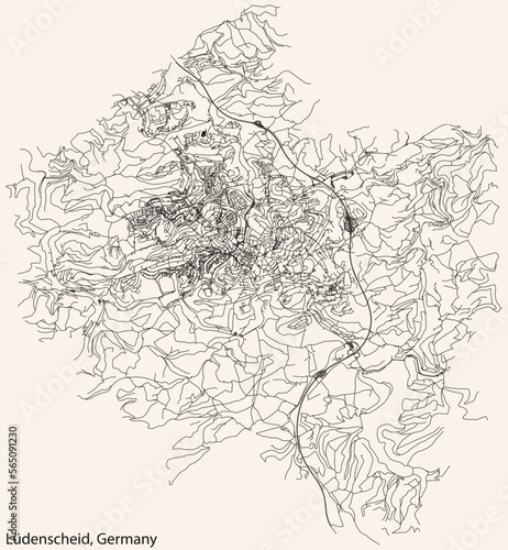 © Momcilo, Fototapeta premium Detailed navigation black lines urban street roads map of the German town of LÜDENSCHEID, GERMANY on vintage beige background