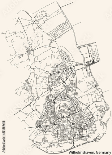 © Momcilo, Fototapeta premium Detailed navigation black lines urban street roads map of the German town of WILHELMSHAVEN, GERMANY on vintage beige background