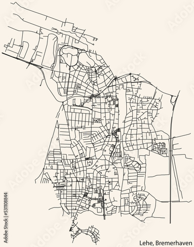 © Momcilo, Fototapeta premium Detailed navigation black lines urban street roads map of the LEHE DISTRICT of the German regional capital city of Bremerhaven, Germany on vintage beige background